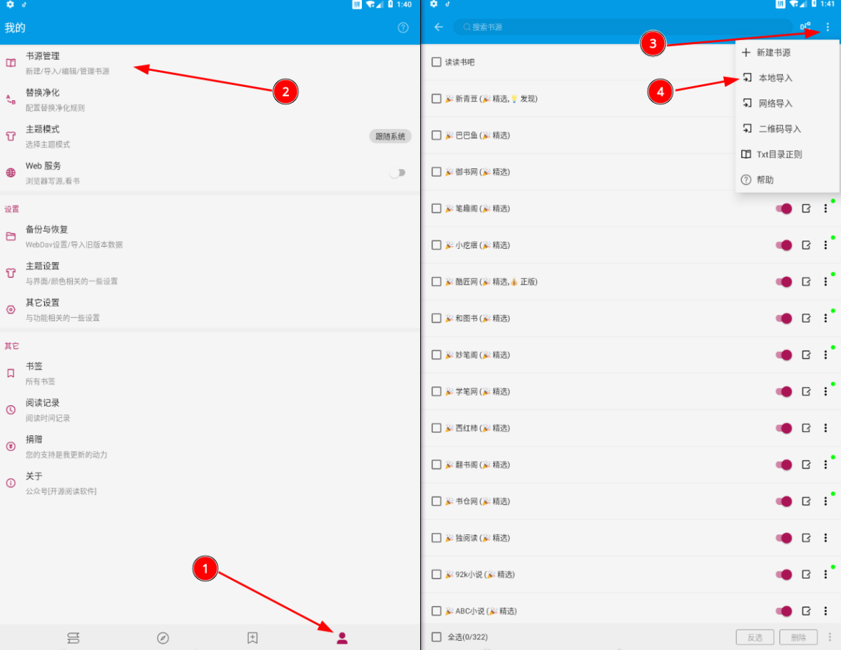 - 安装后打开软件,进入"个人中心",选择"书源管理",点右上角,选择"本地导入",选择"步骤2“中下载的”书源文件",点击右下角ok即可(如果会使用网页源,也可以选择网络导入)