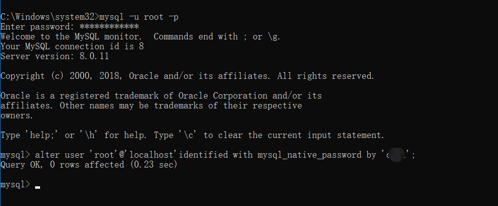 继续输入alter user ‘root‘@’localhost’identified with mysql_native_password by ‘新密码’;