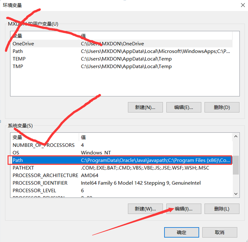 在系统变量下找到path,点一下path然后再点击“编辑”