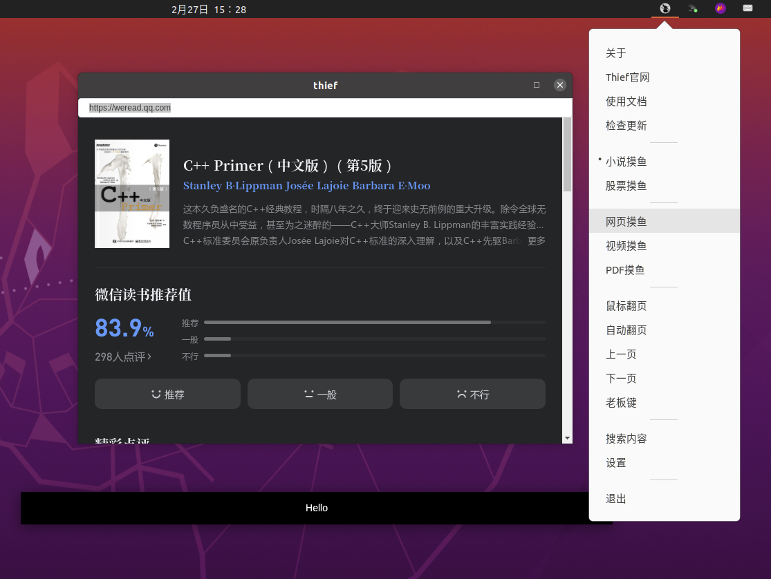 在任务栏有个图标,可以选择不同的摸鱼方式,比如在下面我打开了网页摸鱼,看微信读书: