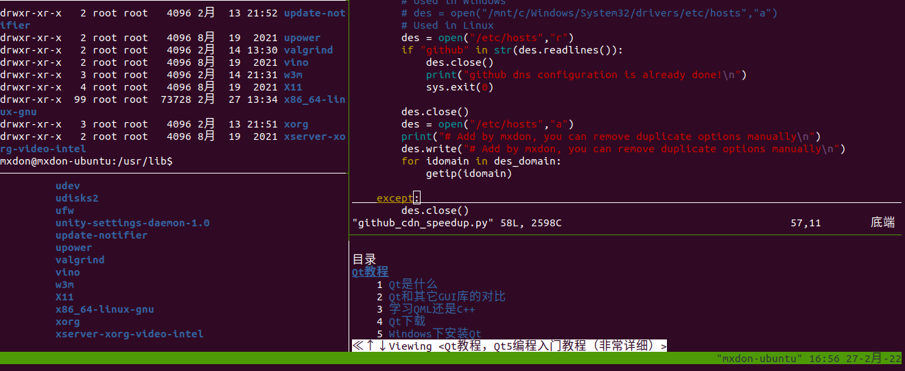 借助tmux和w3m,我在终端里一边写Python,一边学qt,秒啊(我怎么在摸鱼学习??)