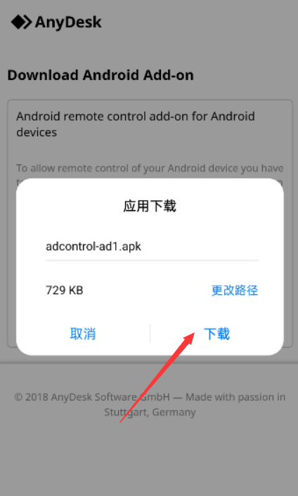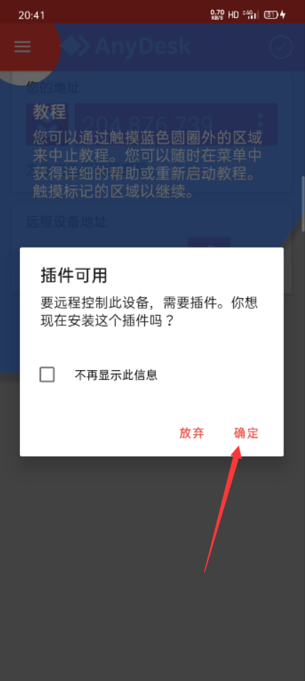 手机端打开anydesk,提示需要安装插件,选择确定: