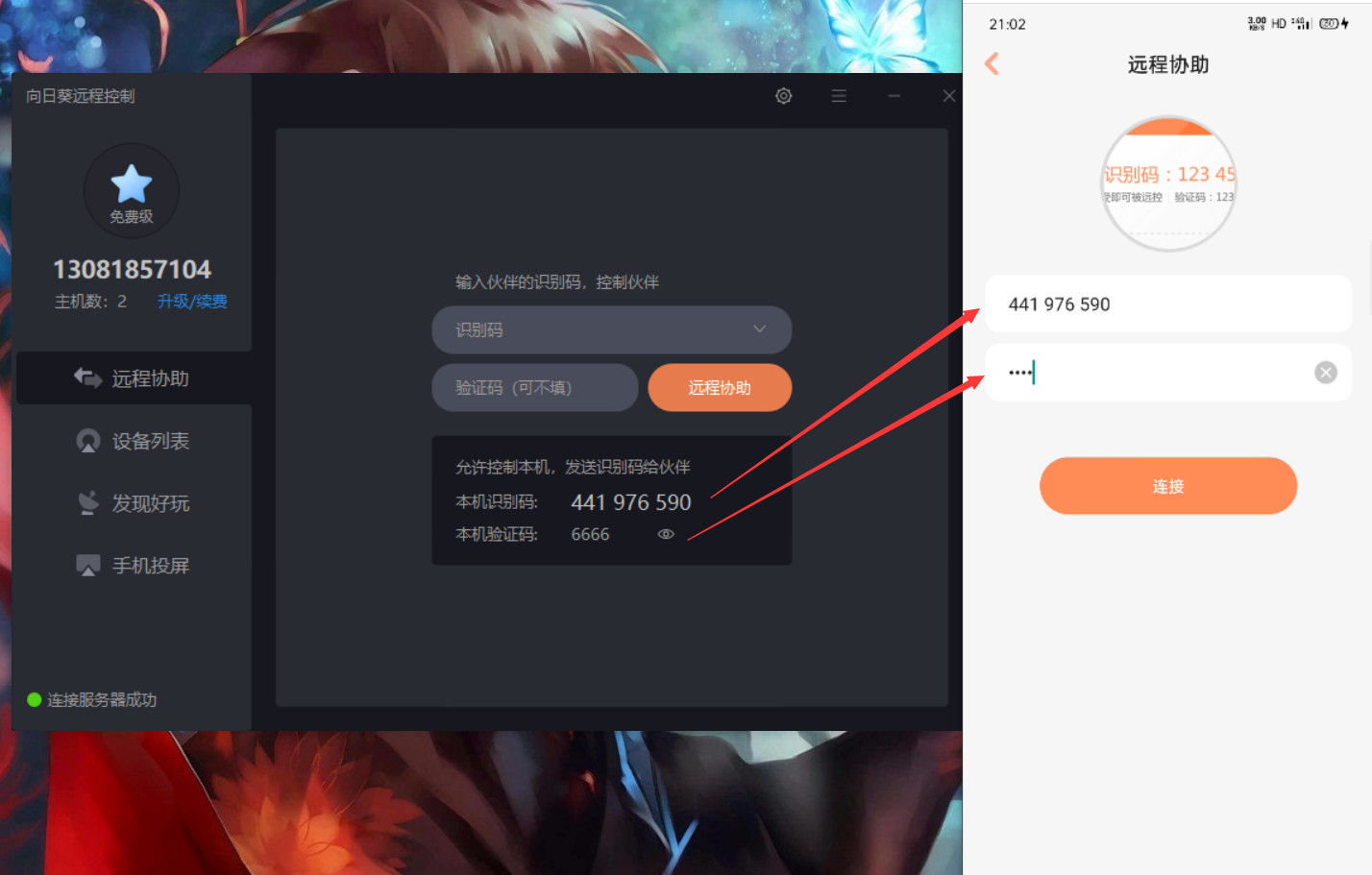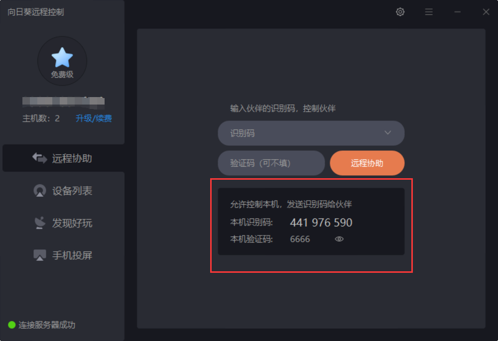 输入识别码和验证码,即可进行远程连接: