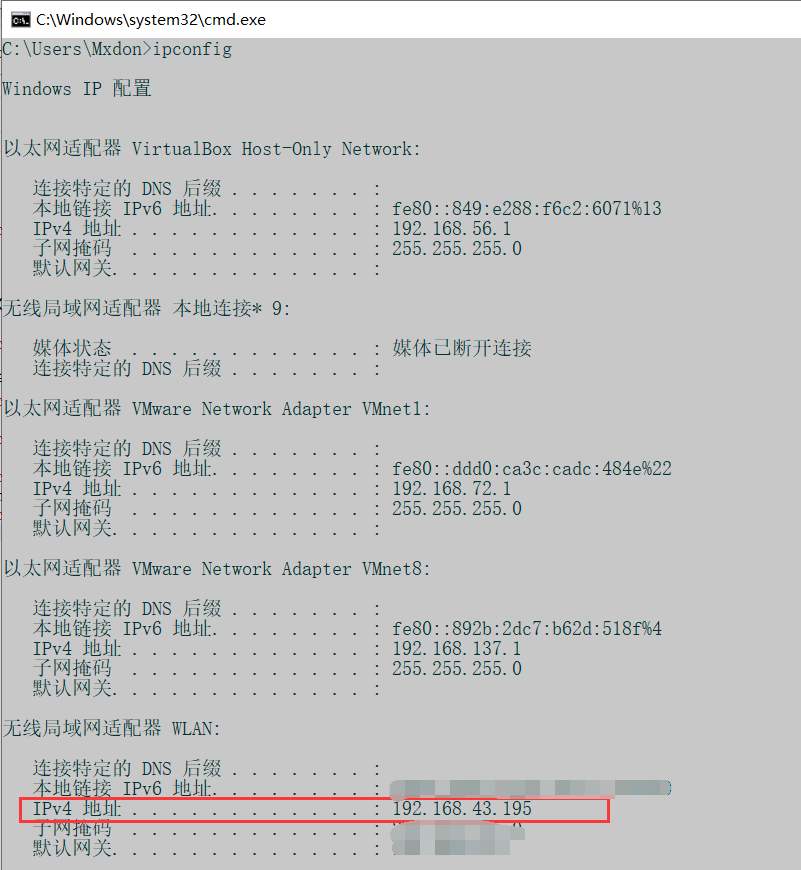 打开命令行窗口,输入ipconfig查看ipv4的信息(以太网的话就看以太网,WiFi就看WLAN)